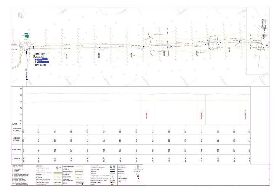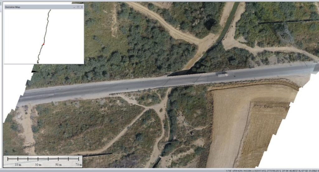 The generated orthomosaic provides a highly detailed and accurate representation of the canal and its surroundings. This stitched-together image mosaic eliminates distortions and offers a bird’s-eye view of the entire survey area. The digital elevation model (DEM) further enhances the dataset by capturing the precise elevations and contours of the canal’s terrain, facilitating effective design and analysis.